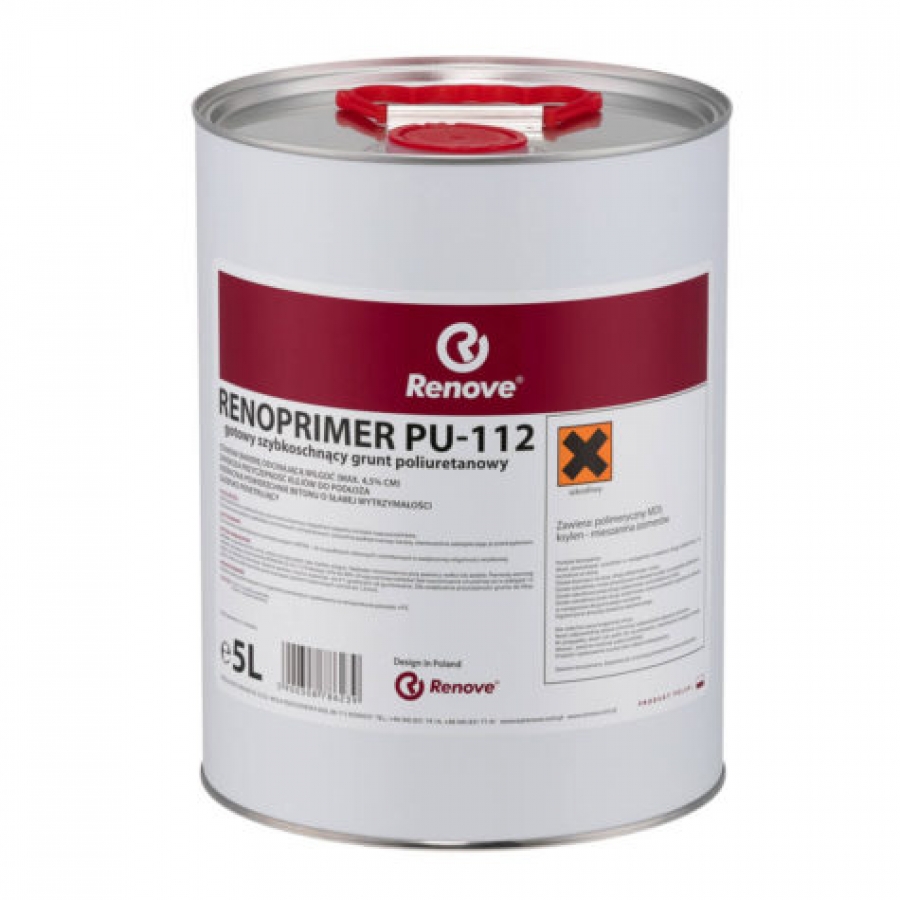 Do wzmacniania powierzchni cementowych, anhydrytowych, również z ogrzewaniem podłogowym. Stosuje się do izolacji wilgotności resztkowej na podkładach cementowych do 3,5 % CM. SPOSÓB UŻYCIA: Podłoże i warunki klimatyczne w pomieszczeniu muszą spełniać wytyczne normy DIN 18356. Z wyłączeniem jastrychów z wilgotnością resztkową, jeśli grunt RENOPRIMER PU 112 stosowany jest do izolacji przed wilgocią resztkową. Przed użyciem dobrze wymieszać poprzez wstrząśnięcie opakowaniem. Nakładać na powierzchnie czyste, bez śladów oleju, wosku i innych zabrudzeń. Rozprowadzać równomiernie przy pomocy wałka lub pędzla – należy unikać powstawania kałuż.
